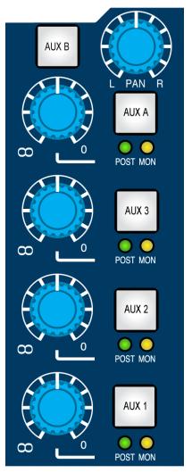 Erstmal : Es gibt zwei Stereo-Auxwege namens A & B. Dazu gesellen sich noch mal 3 Mono-Auxwege. Die Auxe lassen sich sowohl im Channel als auch im Monitorweg einsetzen und dort dann jeweils auch noch Pre- oder Post-Fader schalten. Die Schalterpositionen sind wie gehabt in der Scene-Memory speicherbar. Im Gegensatz zu den Monoauxen besitzen die Stereo-Auxwege A und B einen gemeinsamen Levelregler. Demnach kann man das Signal, wenn beide Auxe aktiviert sind gleichzeitig auf beide Wege schicken. Da es ja Stereowege sind fehlt natürlich der Panregler nicht.