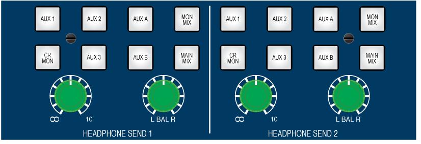 Soo und wo wird´s lustig ? hier: Bei anderen Konsolen ist das Thema Aux beim Auxmasterfader vorbei. Soll der Engineer doch zusehen was er draus macht. Herr Custom 75 hat aber noch zwei Headphone-Busse draufgelegt. Da hat man die Möglichkeit zwei Wege aus der Konsole direkt auszuspielen und dem Künstler auf die Ohren zu geben. Die Busse können mit Aux 1-3 , Aux A & B, Control Room, Main Mix oder Monitor Mix beschickt werden – wenn´s sein muss sogar gleichtzeitig. Damit ist es möglich schnell und einfach zwischen verschiedenen Kopfhörermixen hin- und herzuschalten.