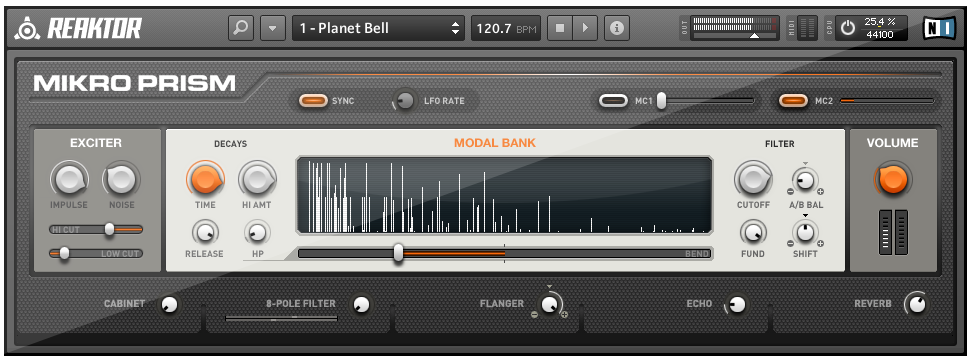 MIKRO PRISM is a new free instrument, based on the successful synthesizer REAKTOR PRISM. Using the same sound engine as its bigger brother and REAKTOR 5.5’s new dynamic “Modal Bank“ technology, this fully-playable instrument shines with a stunning range of brilliant sounds. With 70 presets, the built-in cabinet simulation, filter, flanger, echo and reverb effects and some seasonal bell and chime sounds included, this gift is guaranteed to get you in the mood for the holidays!
